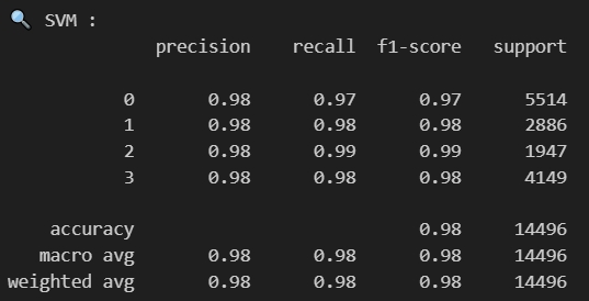 The Support Vector Machine (SVM) model also demonstrates exceptional performance in classifying job postings across all four clusters. With an overall accuracy of 98% on the 14,496 samples, the SVM significantly outperforms the Naive Bayes model. All four clusters show remarkably consistent and high precision scores of 0.98. Cluster 2, despite having the smallest sample size (1,947), achieves the highest performance with 0.99 for both recall and F1-score. Clusters 1 and 3 both maintain excellent 0.98 scores across precision, recall, and F1-score, while Cluster 0 (the largest cluster with 5,514 samples) shows slightly lower but still impressive recall at 0.97. The uniformly high macro and weighted averages (0.98) across all metrics indicate that the SVM model excels at distinguishing between the different job clusters based on their TF-IDF features, making it particularly well-suited for this classification task.