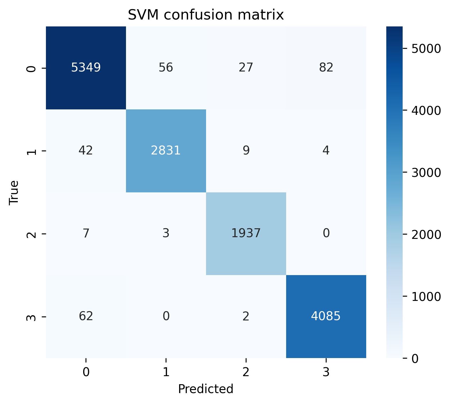 This confusion matrix for the SVM model provides detailed insight into prediction performance across the four job clusters. The diagonal elements represent correct classifications, showing the model’s impressive accuracy: 5,349 correct predictions for cluster 0, 2,831 for cluster 1, 1,937 for cluster 2, and 4,085 for cluster 3.