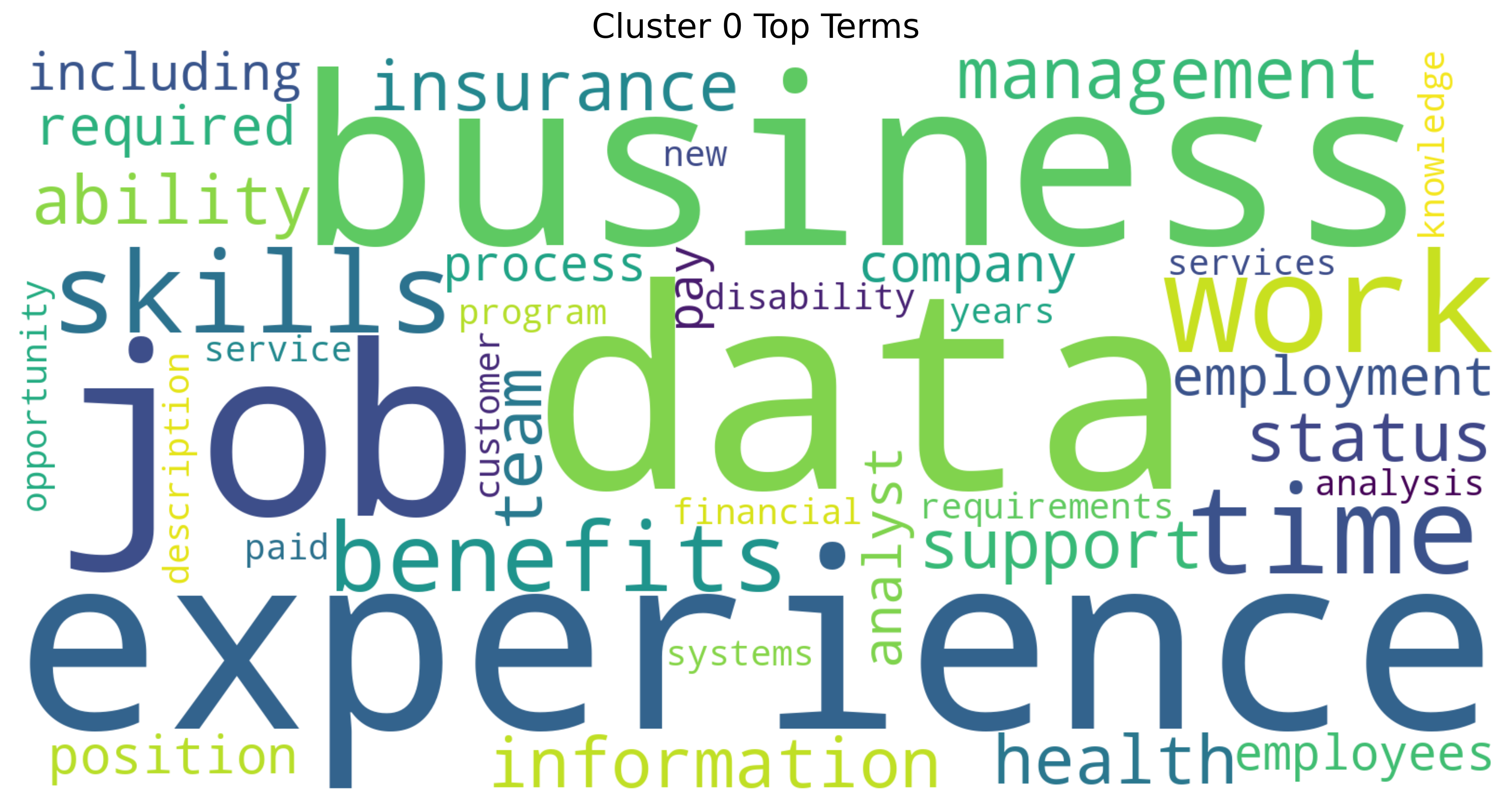 This word cloud for Cluster 0 highlights a strong focus on job-related themes, with “experience”, “data”, “business”, and “job” standing out the most. It suggests that this cluster centers on professional qualifications, workplace expectations, and the value of skills in data and business environments. Terms related to benefits, insurance, and work-life aspects like “time” and “support” also appear prominently, pointing to both the practical and strategic dimensions of employment (Quan and Raheem (2023)).