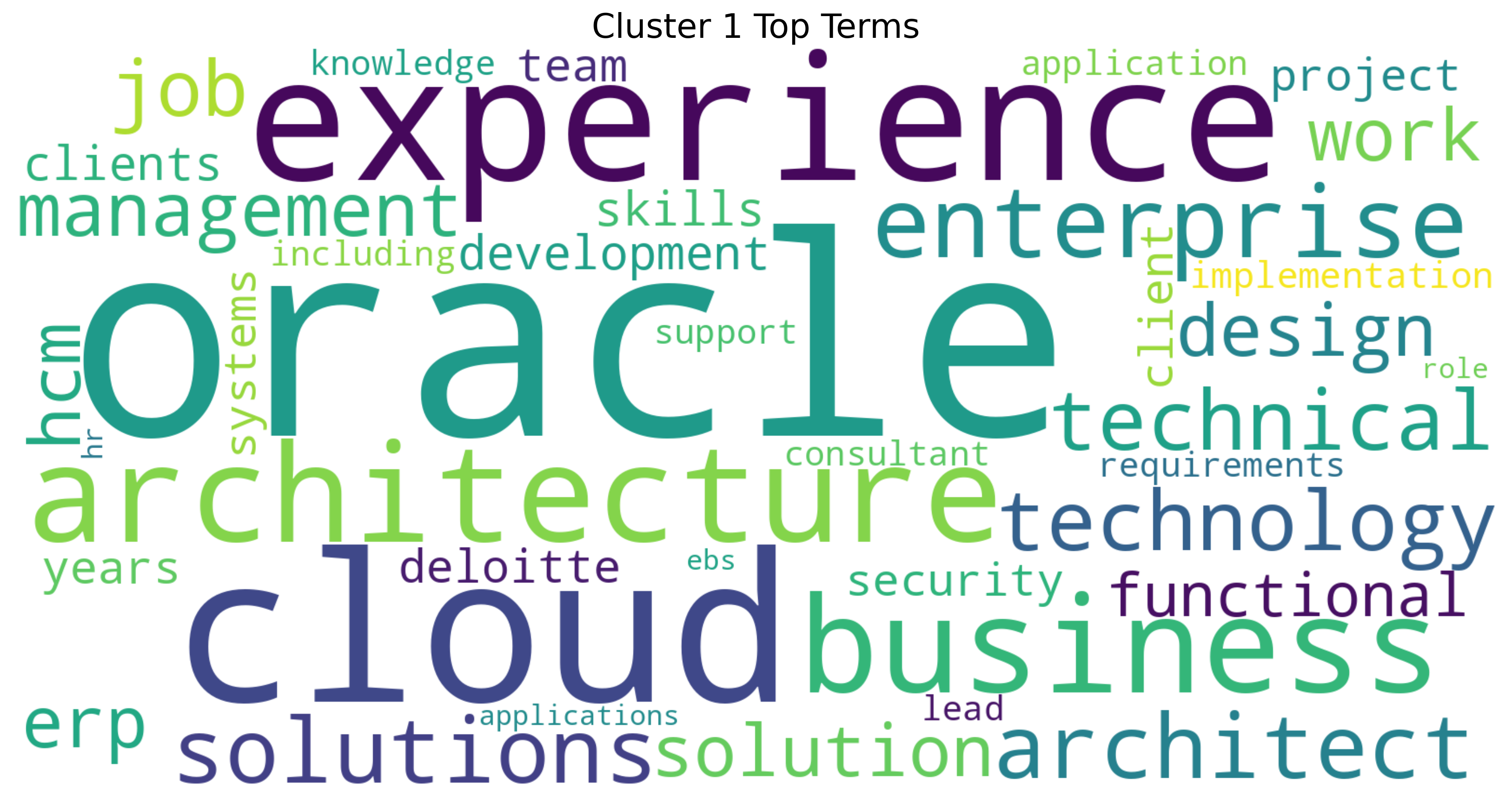 This word cloud for Cluster 1 revolves around enterprise technology and cloud-based solutions, with strong emphasis on “experience”, “oracle”, “cloud”, and “architecture”. It reflects a technical and strategic domain where roles focus on designing and implementing enterprise systems (Khan et al. (2024)). Terms like “solutions”, “technology”, and “business” suggest a blend of IT expertise and business alignment, especially in environments involving enterprise resource planning (ERP) and cloud infrastructure. The presence of “architect”, “technical”, and “functional”, points to both high-level system design and hands-on implementation know-how.