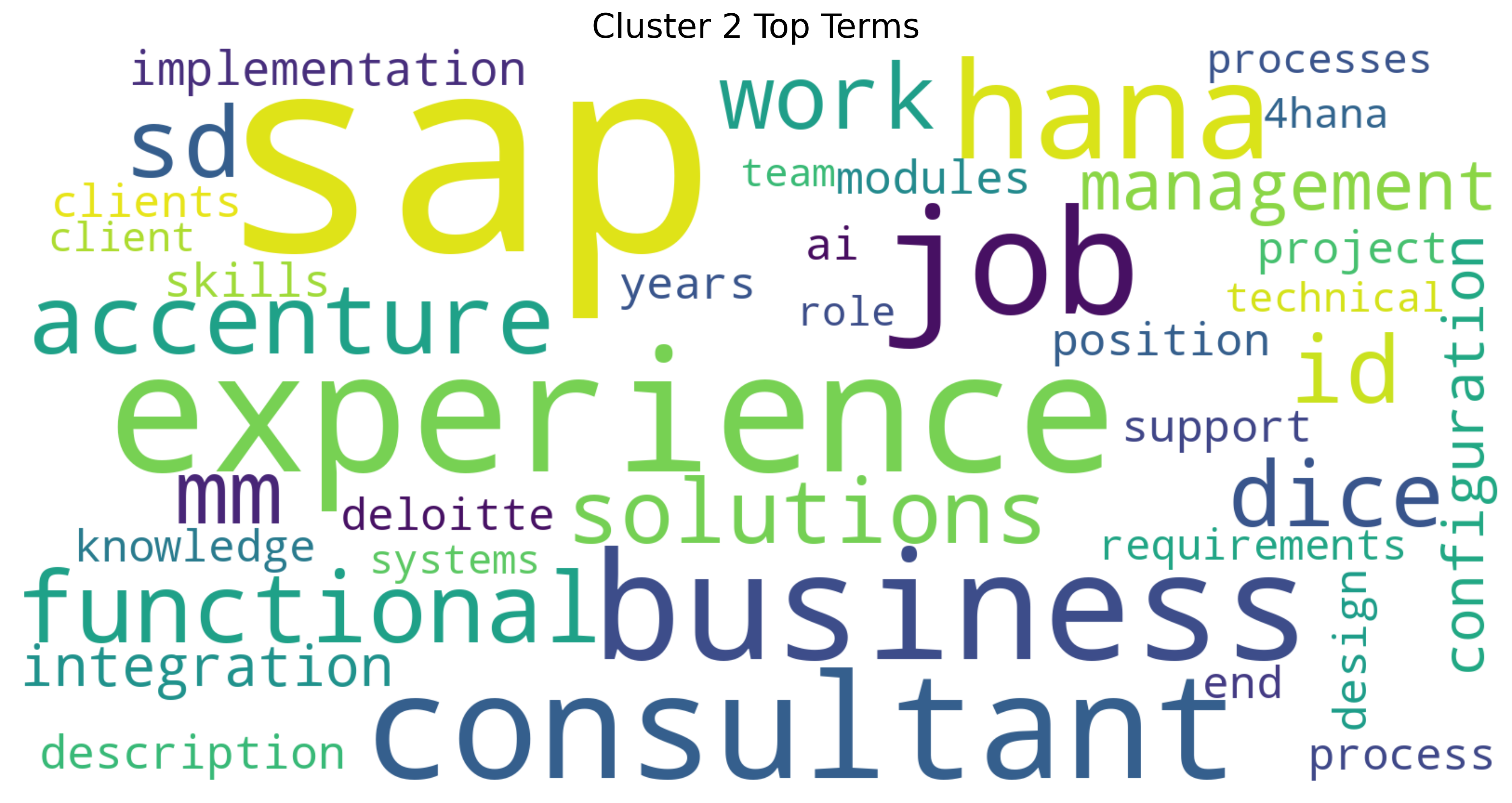 This word cloud for Cluster 2 reveals a strong focus on IT consulting and enterprise systems, with “SAP”, “experience”, “business”, and “consultant” as dominant terms. It clearly centers on the technical implementation and configuration of SAP solutions (Khan et al. (2024)), with consulting firms like Accenture and Deloitte featured prominently. The presence of terms like “HANA”, “integration”, “functional”, and “implementation” points to specialized SAP modules and project work. This cluster represents the professional ecosystem of SAP consultants who bridge technical expertise with business process knowledge.